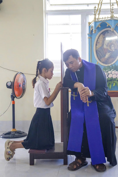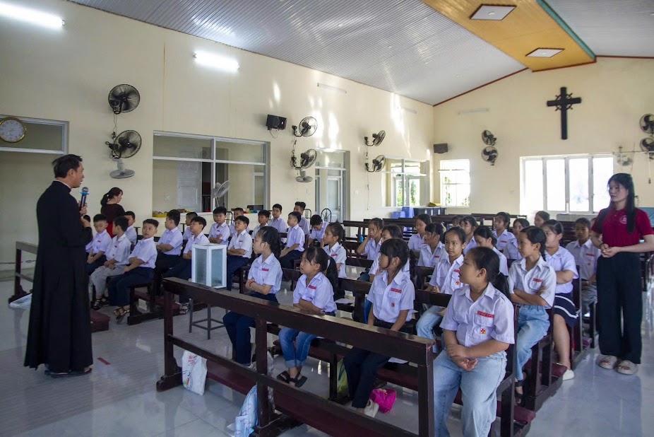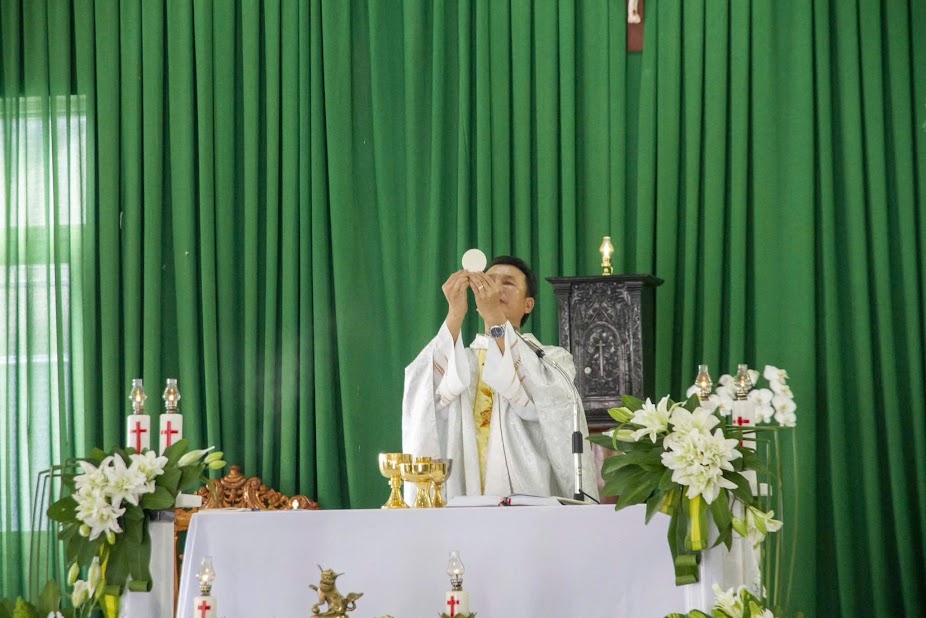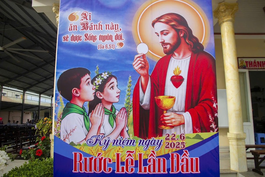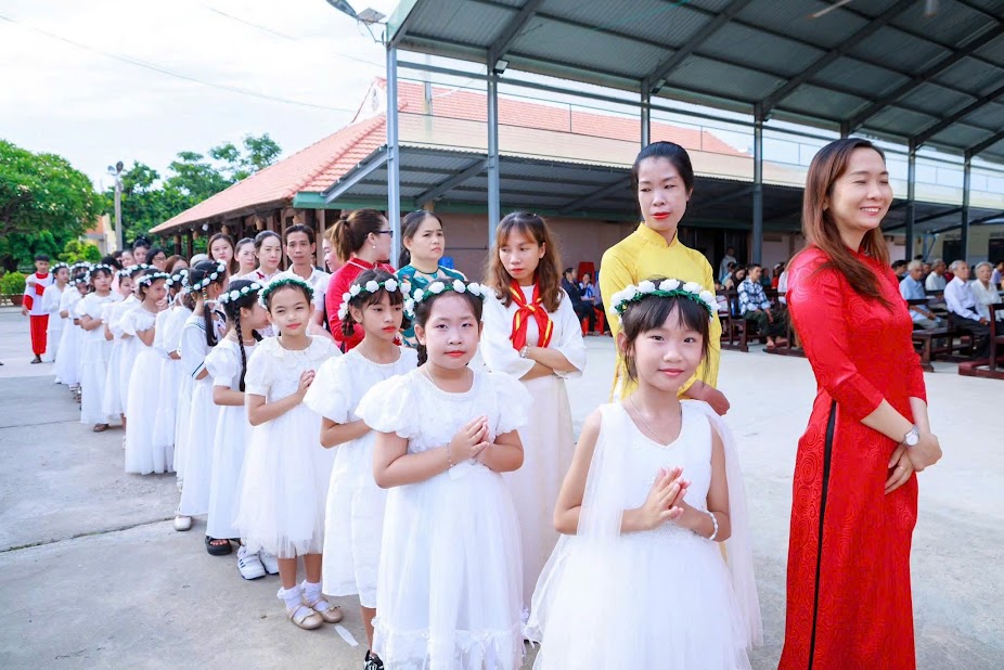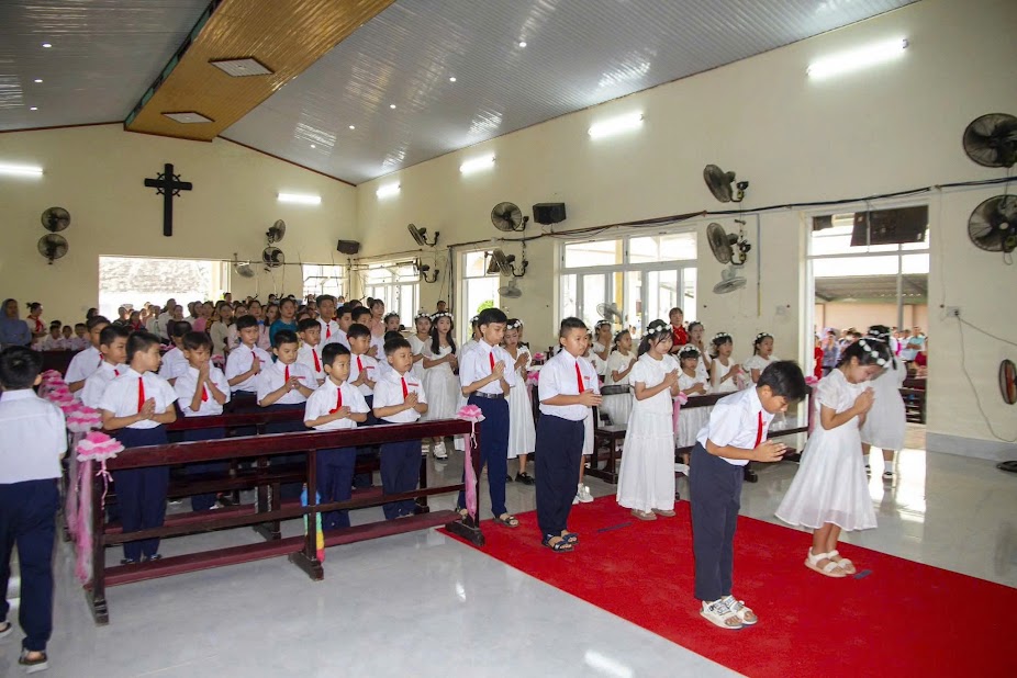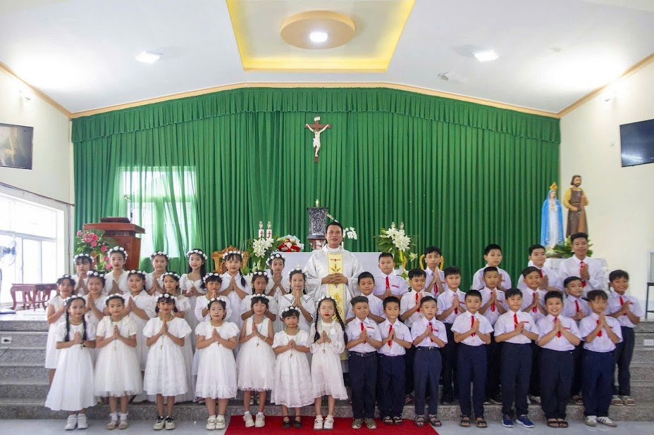 Sáng Chúa Nhật ngày 22 tháng 6 năm 2025, cha Quản xứ Gioan Phan Tiến Dũng đã dâng Thánh Lễ trọng Kính Mình Máu Thánh Chúa và cho 39 con em trong giáo xứ được đón nhận hồng ân Thánh Thể lần đầu. Trong bầu khí trang nghiêm và sốt sắng, các em – trong trang phục trắng tinh khôi – đã tiến lên cung thánh với vẻ mặt rạng rỡ, mang theo niềm vui và lòng khao khát được đón Chúa Giêsu Thánh Thể vào lòng lần đầu tiên. Các em đã được cha quản xứ, quý sơ và thầy cô giáo lý viên chuẩn bị trong thời gian 2 tháng qua với việc học hỏi thêm về Bí tích Hòa Giải và Bí tích Thánh Thể. Và ngày thứ bảy trước đó, các em được giúp dọn lòng qua việc lãnh nhận Bí tích Hòa Giải lần đầu để chuẩn bị tâm hồn trong sạch đón Chúa.