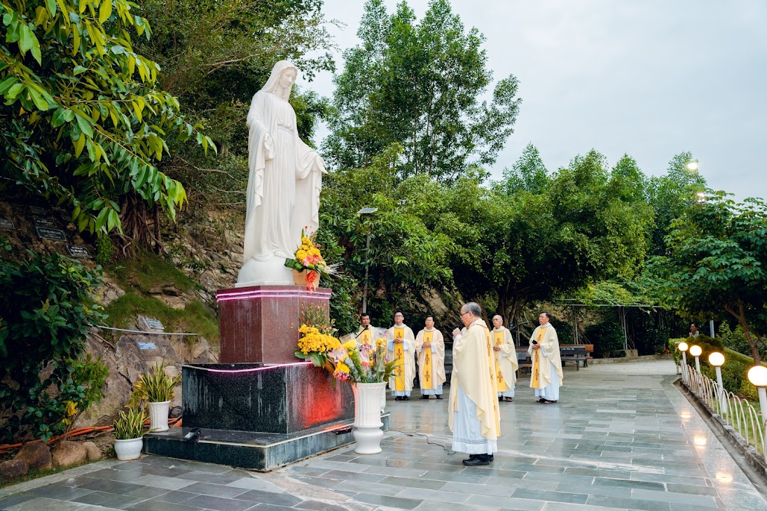 Cuối thánh lễ và sau lời nguyện hiệp lễ, Đoàn Đồng tế đã quây quần bên Linh đài Mẹ Nhân Lành và đông đảo Cộng đoàn tham dự đang hướng ánh mắt nhìn Mẹ,để dâng lên Mẹ, để nhờ Mẹ chuyển cầu những ý nguyện dành cho Giáo phận, Giáo hạt, Giáo xứ, cho gia đình và cho chính mỗi người.