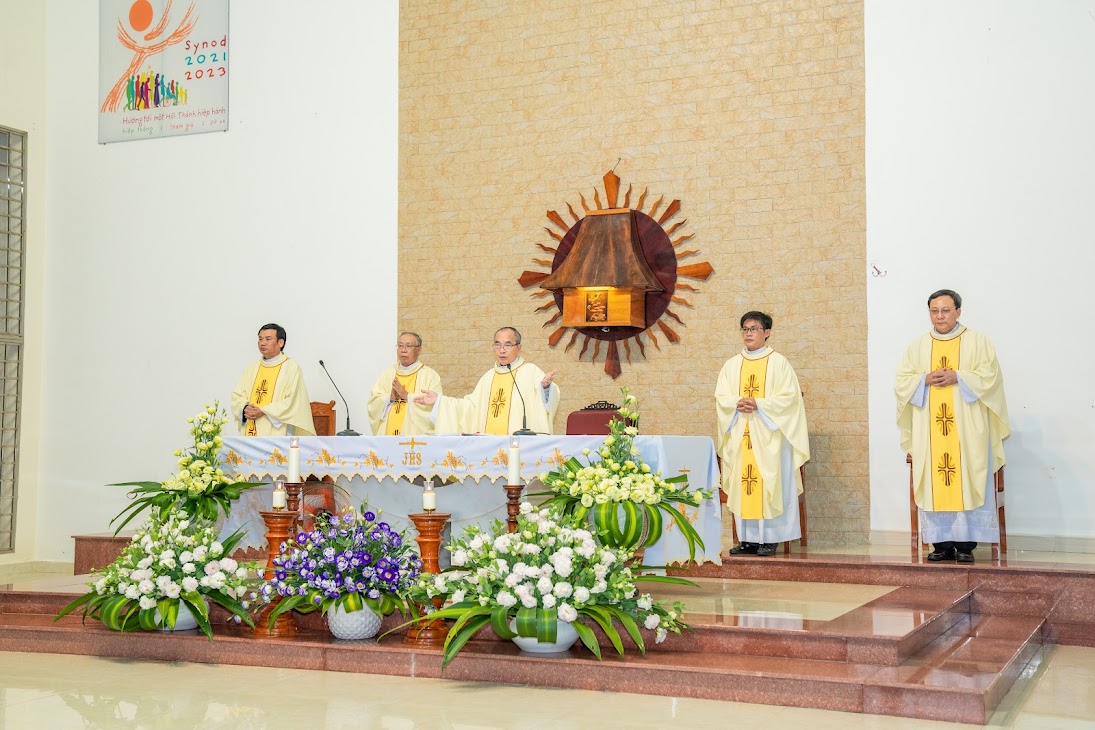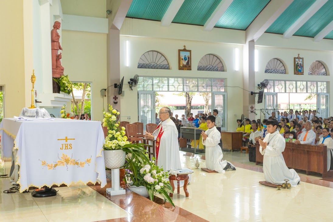 Đúng 16g00 Thánh lễ đồng tế do Cha Tổng Đại diện chủ sự, cùng đồng tế với ngài còn có Cha Quản xứ Giáo xứ Khánh Vĩnh và Quý Cha Đặc trách trong Giáo phận.