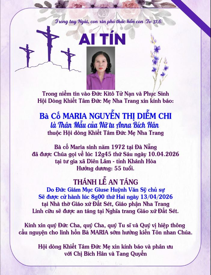 Ai tín: Bà cố Maria Nguyễn Thị Diễm Chi, thân mẫu nữ tu Anna Bích Hân thuộc Dòng Khiết Tâm Đức Mẹ vừa tạ thế