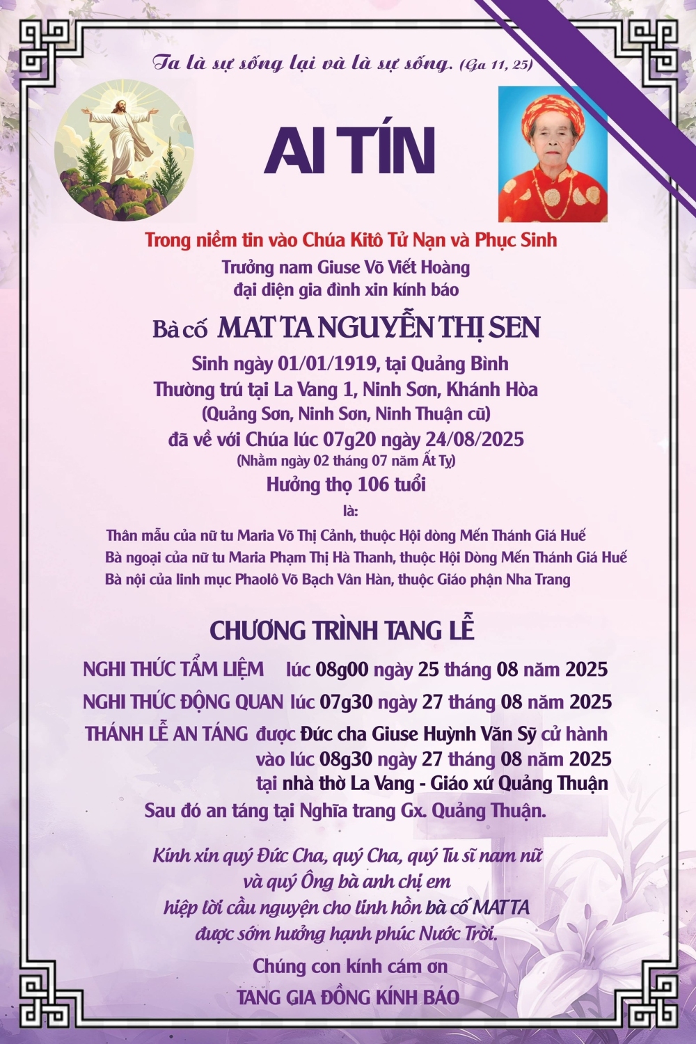 Ai tín: ông cố Phêrô Trần Trúc, thân phục của cha Phêrô Trần Lê Thanh Tùng vừa tạ thế tại Giáo xứ Xuân Ninh, giáo hạt Cam Ranh