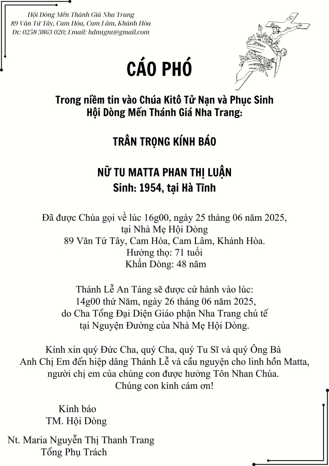 Ai tín: ông cố Phêrô Nguyễn Văn Hội thân phụ của 3 Sr Nhi-Liên vàThanh thuộc Dòng MTG Nha Trang vừa tạ thế
