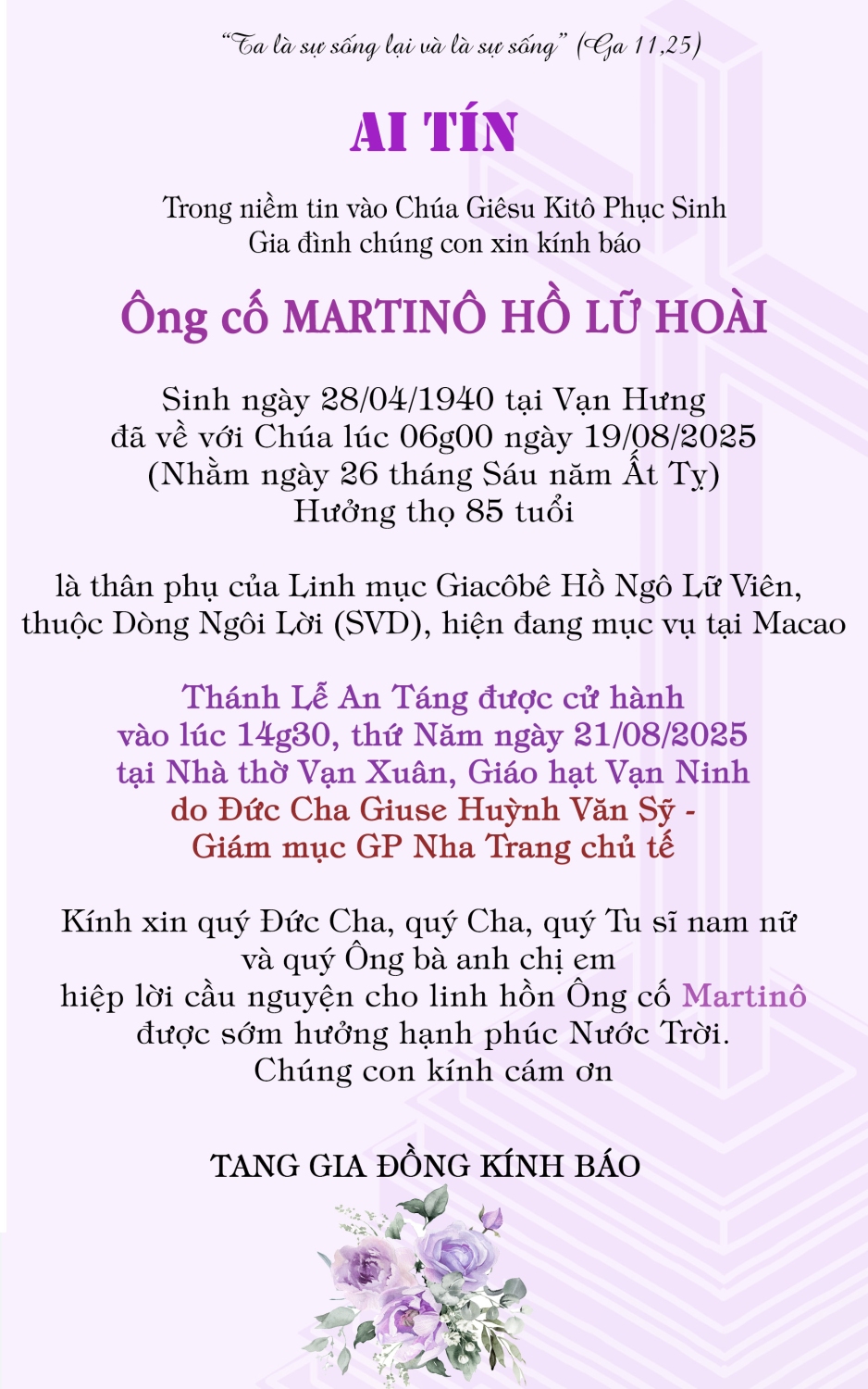 Ai tín: ông cố Phêrô Trần Trúc, thân phục của cha Phêrô Trần Lê Thanh Tùng vừa tạ thế tại Giáo xứ Xuân Ninh, giáo hạt Cam Ranh